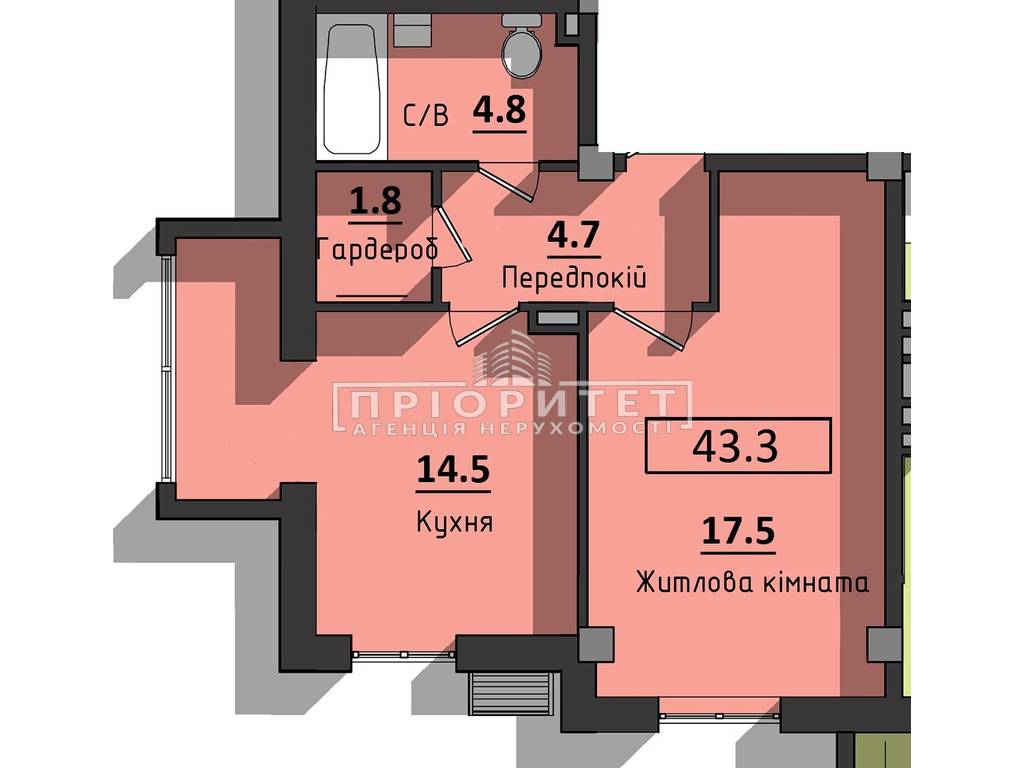 1-комнатная квартира, 42.80 м2