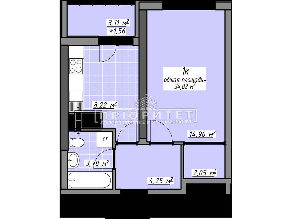 1-комнатная квартира, 35.00 м2