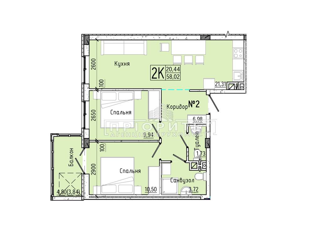 2-кімнатна квартира, 58.02 м2