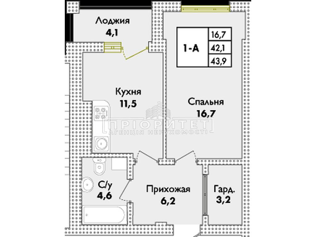 1-кімнатна квартира, 43.65 м2
