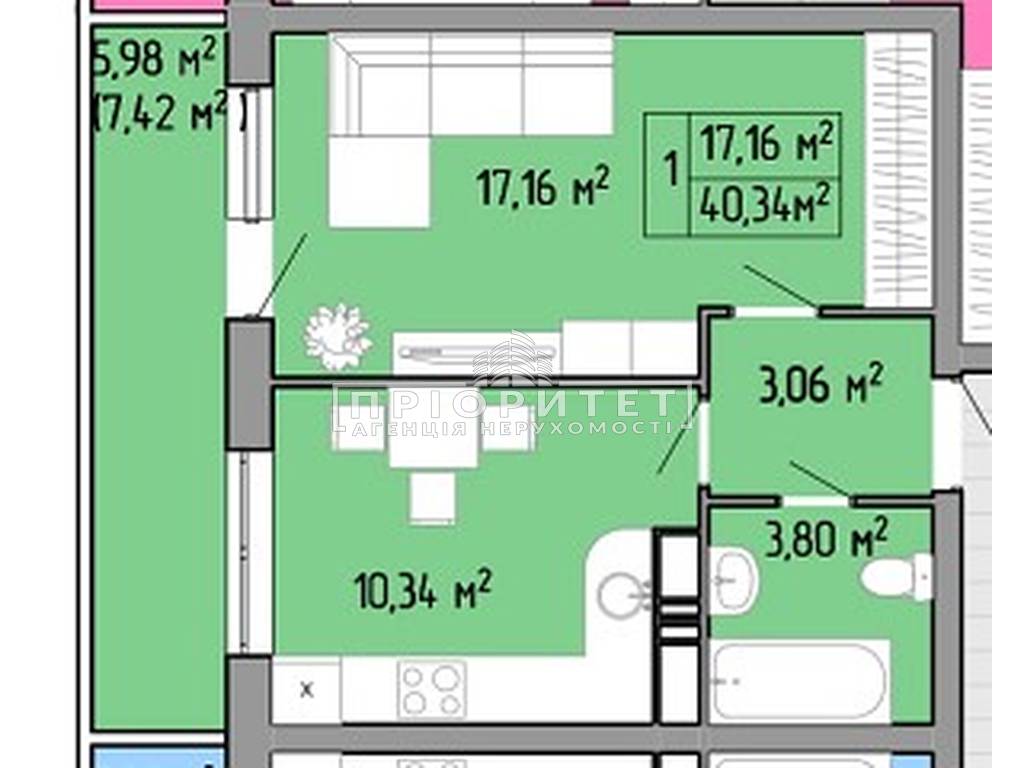 1-кімнатна квартира, 40.00 м2