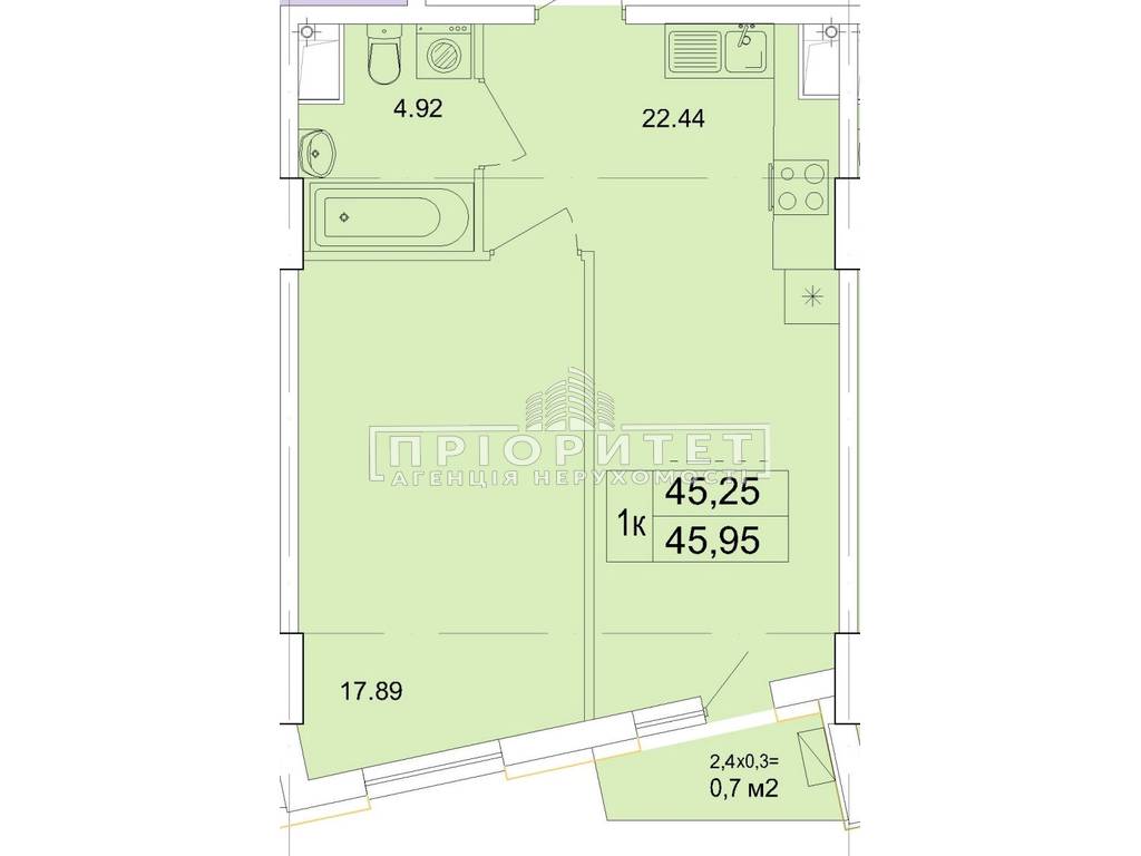 1-кімнатна квартира, 45.95 м2